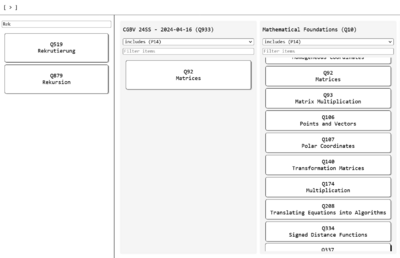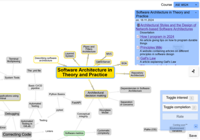 Students can interact with the graph using a visual editor. It shows a specific course and all items it includes. It allows students to explore the graph, see learning paths towards specific topics and quickly mark items as prior knowledge or a topic that they are interested in.