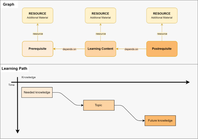 At the lowest level our graph is structured by linking learning contents to their prerequisite(s). Students can use these links to determine how topics depend on each other, and what knowledge is required to understand a specific item. Materials (such as tutorials and articles) or exams can also be linked to each learning content.