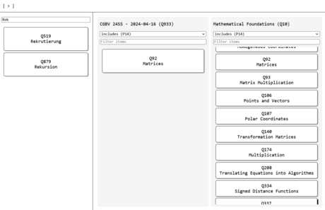 Students can interact with the graph using a visual editor. It shows a specific course and all items it includes. It allows students to explore the graph, see learning paths towards specific topics and quickly mark items as prior knowledge or a topic that they are interested in.
